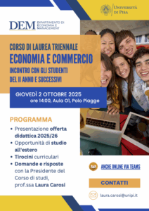Per iniziare l’anno accademico, il Corso di laurea triennale in Economia e Commercio organizza un incontro di orientamento in itinere dedicato alle studentesse e agli studenti del II anno e successivi, per fornire informazioni utili per la scelta degli esami in rosa, per illustrare le opportunità di tirocinio curriculare e di studio all’estero e le modalità di svolgimento della prova finale.